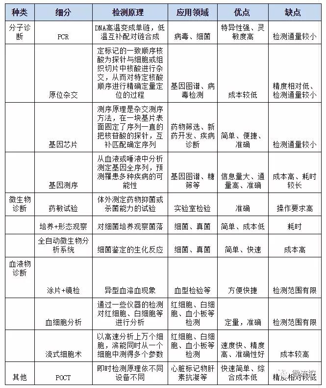 目前分子诊断在体外诊断中的主要的应用领域,包括对病毒、细菌等微生物的筛查及定性定量检测,药物筛选及用药分析以及基因早期的分析。在微生物检验检测方面,分子诊断相对于免疫诊断具有一定的优势;基因图谱分析方面,虽然目前相关研究很多,但在该领域应用的临床价值还有待发掘。