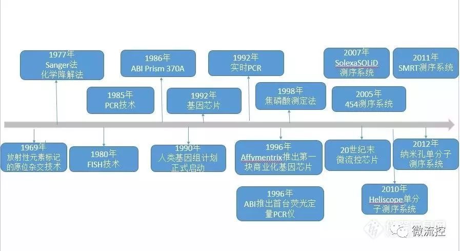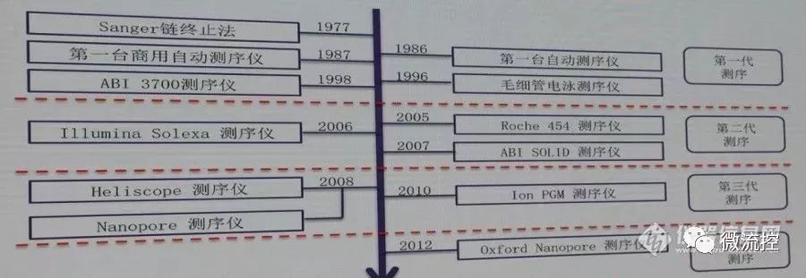 接下来是PCR仪器的发展。早期的PCR仪器,是简单的DNA解链、复制、复性等过程,除了水浴锅自动化,并没有太多技术含量。数字PCR技术出现后, 与生物信息学和微型加工技术关联起来,发展速度很快。再后来出现了微流控技术和基因测序技术。基因测序技术经历了一代、二代、三代,目前测序技术,仍然是重要的发展方向。