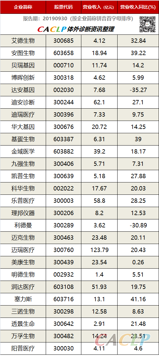 近年来,我国IVD产业以15%以上的年增速快速成长,2018年我国的体外诊断产品市场容量已达700亿元,成为整个医疗器械行业中增速最快的细分市场,体外诊断企业因此也备受关注,2019年第三季度26家IVD相关上市企业季报已陆续公布,小编为您整理如下: