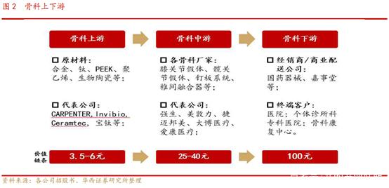 上游包括:金属材料企业,生产钛及钛合金材料是新型生物;惰性生物陶瓷如氧化铝陶瓷应用于人工关节;活性生物陶瓷如羟基磷灰石及生物活性玻璃用于需长入的假体表面涂层、人工植骨材料等;可吸收生物陶瓷如磷酸三钙等,多用于填充植骨材料。高分子材料被广泛用于脊髓、肌腱、骨水泥等材料。上游原料已经能够实现国产供应,且竞争充分。