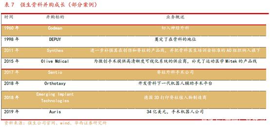 直到2011 年,强生并购Synthes,进一步补强其在创伤和脊柱的产品线,同时把骨科医生培训金标准机构AO 组织纳入旗下,奠定了强生在骨科无可撼动的地位。2015 年,强生并购Olive Medical,一家为微创手术提供高清晰度可视化系统的供应商,补充了运动医学Mitek的产品线;2017 年,强生切入3D 打印领域,获得TRS 公司的3D 打印技术;2017 年7 月,强生收购脊柱外科手术公司Sentio;2018 年2 月,强生宣布收购Orthotaxy公司,用以开发骨科下一代机器人辅助手术平台;2018 年9月,强生医疗宣布收购德国3D 打印脊柱植入物制造商