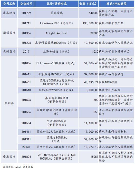 不仅如此,国内骨科耗材上市企业近年也都积极通过海内外并购方式或扩充骨科产品管线,或获取国内外技术先进企业技术升级高端市场,或扩展血管介入市场,或获取国内外的市场销售渠道。凯利泰上市后资本运作较活跃,前期并购的血管介入耗材产品又被剥离,并专注于骨科。