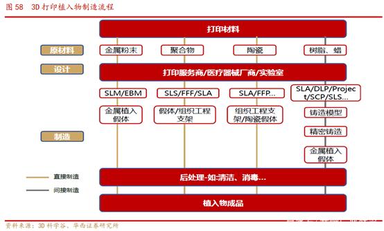 新技术对骨科产品的推动在不断涌现,3D 打印技术在骨科治疗中特殊的应用场景应用尤其重要。3D 打印指在电脑控制下对塑料、金属、陶瓷、粉末及液体等物料进行接合、融合或堆砌的过程。医疗行业中,3D 打印技术一开始只是应用在手术辅助工具例如手术规划模型、定制化的手术导板等,现在已经逐渐被应用到标准化植入物、个性化植入物、定制化假肢,甚至是缓释药物和有生命的人体组织。以下是3D 打印植入物制造流程: